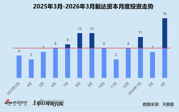 统计区间内,毅达资本公开披露的股权投资事件共16起,较2025年同期增长166.7%,与2月相比增长128.6%。往期数据显示,毅达资本在近一年内保持了较为稳健的投资频率,月度投资数量多在5-12起之间波动,3月的“爆发式”增长刷新了单月最高纪录,凸显其策略性的集中发力。