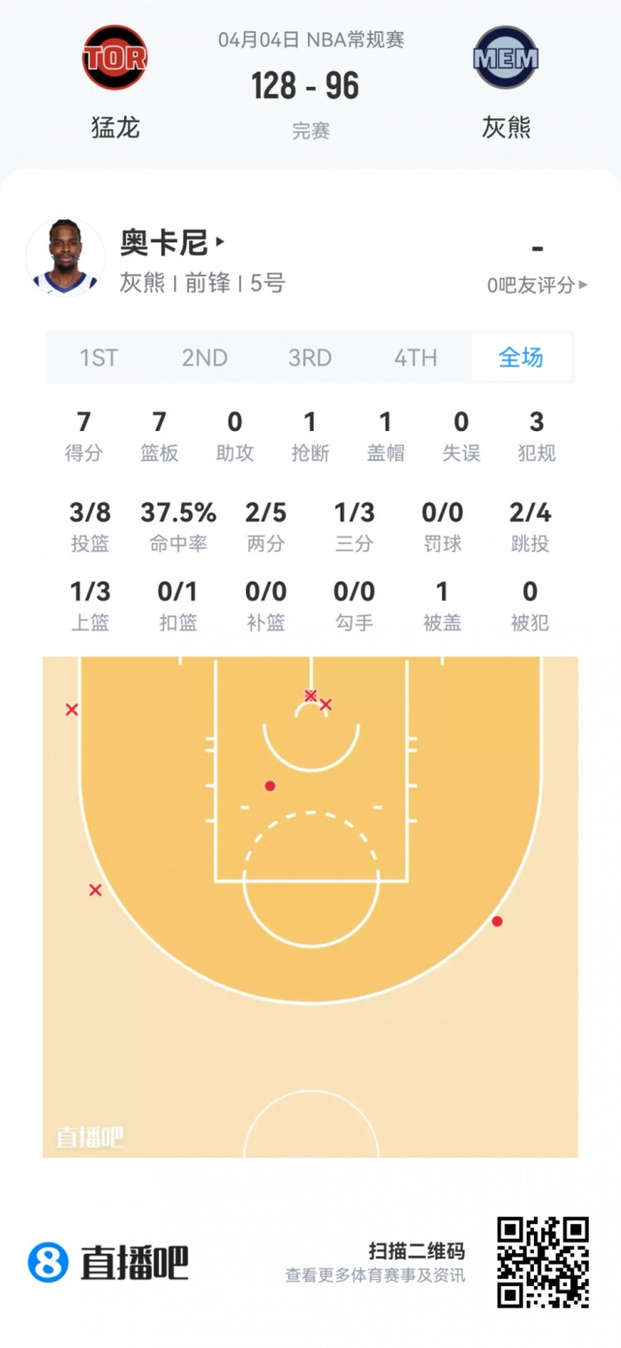 灰熊落选秀奥卡尼 登场28.4分钟