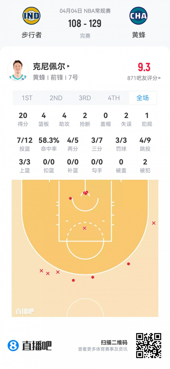 黄蜂次轮34号秀卡尔克布伦纳 登场24.7分钟